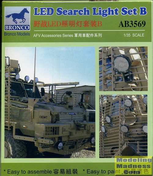 For those building a modern US Army vehicle as operated in the Middle East, Bronco has provided a set of LED searchlights for you to attach to the cage framework that covers many of these vehicles. The set comes with two styles of lights, separate lenses, and photo etch brackets. Additional bolt detail is molded onto the sprues and one simply cuts off what is needed to apply to the bracket.