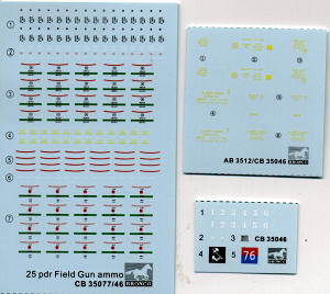 Color information from a variety of sources is also provided. The decal sheets are pretty much data markings for the included ammunition and ammo boxes. You can either paint your gun in a field green as shown on the box art or a desert tan shade. There is a sheet for gun numbers and badges, though nothing is identified.