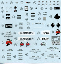 The decal sheet is very nicely done and provides markings for three vehicles, all with a sand base color. First is a US Army 101st Airborne vehicle from Iraq in 2006. This one gets most of the colorful markings, such as they are. Next is a USMC version from the same place and time. The third option is a French Army one from Afghanistan in 2008. This has large areas of chocolate brown painted on it in what looks like a hand brushed scheme.