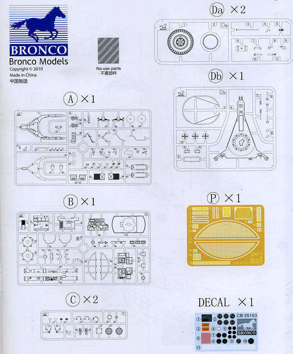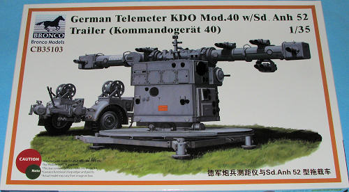 The kit includes not only the telemeter, but also its trailer. In this case it is a pretty standard Sd. Anh 52 that can be towed by vehcles of nearly any size. The detailing on the parts is very much up to Bronco's standards and includes a nice photo etch fret. This fret is used for some small handles, fender braces on the trailer and the grate standing platform for the telemeter itself. The main body of the telemeter consists of the long optical arms and the large analog range computer to which it is attached. I would have expected a clear sprue for lenses, but apparently they are not required.