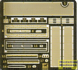 Bronco kits are not Tamiya kits and so there are a lot of parts involved in putting one together. In fact, the first eight steps of construction concentrate on the hull. Areas involved are the driver's position, the torsion bar suspension and the attachment of road wheels, sprocket and idler gear along with the rear engine cooling screen. While on the subject, you can see that the p.e. fret is not all that intensive, something that will please those builder's who are not all that fond of the material. What is provided (screens, braces and brackets) are quite appropriate for the medium.
