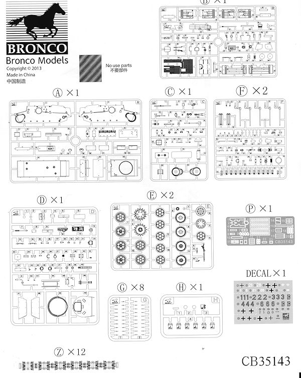 Instructions are typically well done as is the norm for Bronco. They are in booklet form and in color. Markings are provided for three specific tanks though there are enough to do others if you wish. The first color option is tan with large splotches of green and red brown. This vehicle was with the 1st Panzer Division in Russia during 1943. An overall panzer grey vehicle with the polizei-panzer-kompanie on the eastern front in early 1944 is the second option. Third is a tan with red brown disruptive camo tank with Panzer-Abteilung z.b.V 66 in Russia in the fall of 1942. Several turret number options are provided for this one. Decals are nicely done and in register.