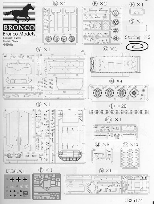 One can have the large side covers either open for the firing position or closed in the travelling position. A decision as to which way these will be modeled needs to be made fairly early in the build. There are also hatches in these side covers that can be opened when in the travelling position. Storage space is provided on the inside of these shields and the kit comes with a variety of helmets, guns and such to place there. A nicely done photo etch set is provides which consists of a variety of small braces, handles and other bits. There are three large screens for the back of the vehicle. Lengths of twine are included to use as tow cables.