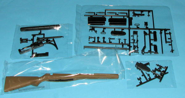 As you can see from the photo of the sprues in their sealed bags, there are four smaller sprues, one large one, the gun stock and a long spring. This spring is for inside the barrel as the gun has realistic bolt action as well as a working trigger and removable magazine. There are two bullets. The instruction sheet is minimal as you'd expect with a painting guide and simple construction diagrams.