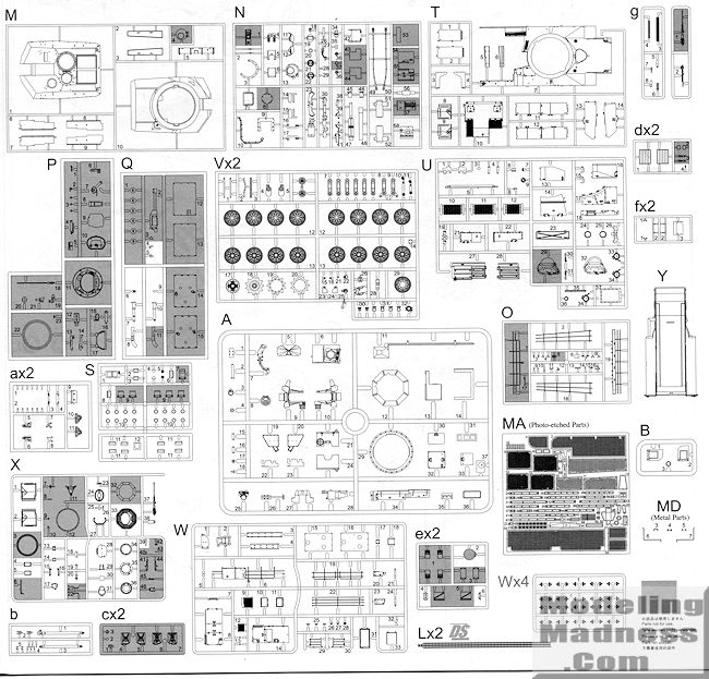 Instructions are very nicely done with the usual Gunze paint references. Despite the cover tank being in desert tan, all three markings options are in the three color European scheme with tanks from 9th Infantry Division and 72nd Armor Regiment based in South Korea and with the 5th Cavalry Regiment in Germany. Decals are very nicely done and you get a pair of what look to be stickers to place on the front of the turret. I'll assume this is part of the tank's aiming system as I assume it is some sort of radar.