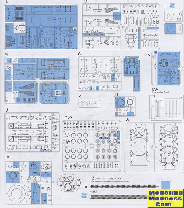 The turret and the turret machine gun position are also nicely done and you ahve the option of having various vision ports open or closed. Thanks to the relatively low (300) parts count and minimal metal parts (aside from a metal wire tow cable and a small p.e. fret with brackets), it is a kit that will build pretty quickly and will be well liked by those who don't like individual track links or a lot of photo etch.