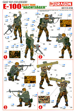 Instructions are well done with Gunze paints as the standard. There is a full color painting and construction guide for the four figures that includes suggestions for the camo uniforms. Markings are for one tank in overall panzer tan with green and brown streaks, though you could easily paint this about any color you'd wish. A nicely done decal sheet is provided to give you a choice of markings.