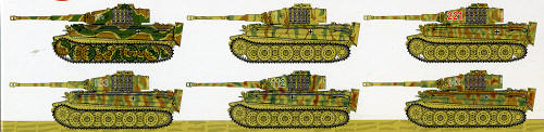 Instructions are quite comprehensive and somewhat complex as you'd expect with hundreds of parts and multiple pieces for the various options provided. Color information is from Gunze and Model Master. All six painting options are for vehicles with a base of Panzer Sand and then either brown, or green, or both used in a disruptive pattern. An interesting addition to the painting guide that I've not seen before (or don't remember seeing) is that there is a listing of what optional parts are to be used with each option. The tanks are all from the 1944 period as follows: (reading across the top from left to right) 1./s Pz.Abt 102 in Normandy in 1944, 2./s Pz Abt in Normady during 1944, 9./Pz Rgt 3 'Totenkopf' in Poland 1944, 2./s Pz Abt 102 in Normady 1944, 1./s Pz Abt 101 Normady 1944 and s.Pz Abt 508 in Italy in 1944. Decals are well printed and I've had good luck with them in the past so am sure these are no different.