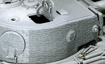 Other upgrades are to the mounting of the exhaust shields, the design of the turret escape hatch, and the detail on the hull, which necessitated a new mold hull section. There are a few other bits and pieces that are upgraded as well. The kit comes with a selection of brass screens and a selection of photo etched bits. The tow cable is steel cable so you can't get much more realistic than that. An interesting part of this kit is that there is a semi-working suspension. You actually glue in all the plastic torsion bars to the opposite side of the interior of the hull, so get the movement effect of the real tank (though without the weight that comes with it).