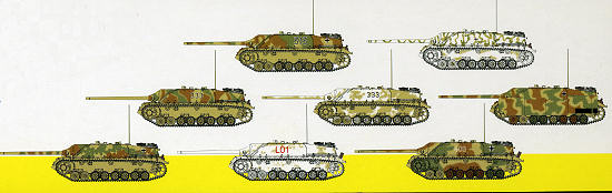 The kit provides options for eight different vehicles. Basically all are in panzer yellow with a variety of brown and green camouflage schemes. A couple of them also have a white winter wash over the camouflaged scheme. There is 15 PzGrenDiv on the western front in 1945, PzDiv 'Feldherrnhalle' in Budapest during 1945, 13 PzDiv in Hungary during 1945 (two options), 9 PzDiv 'Hohenstaufen' - Hungary 1945, 1 PzDiv 'LAH' - Belgium 1944, StuArtBrig.210 - Germany 1945 and 7 PzDiv eastern front 1945.