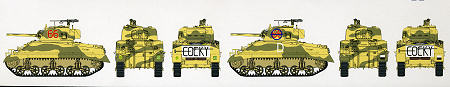Markings are for one tank with two units; COCKY from first the 41st RTR, 24th Armoured Brigade at El Alamein in November 1942, and then a month later when it was part of C Squadron, the Royal Scots Greys. This appears to be in standard OD and desert tan (or possibly a dried mud coating).