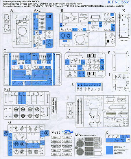 For this particular kit, Dragon has added two new sprues to what is basically their Panther ausf G kit. These sprues consist of the sheet metal mentioned in the historical background to disguise the tank to look like an M 10. For the specifics, I'll let the Dragon PR folks list the details: