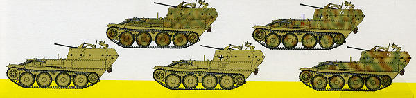 Markings are rather generic, considering that the most they carried were insignia and perhaps numbers. There are five painting options, all based on Panzer Yellow, with some having a brown and green pattern randomly applied. The vehicle with no insignia and in overall Panzer Yellow is one of the test vehicles from the BMM factory. All the rest are with the 12 Panzer Division in France during 1944. with one being an 'unknown' unit.