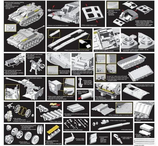 This is another of Cyber-hobby's one time release kits and is of the initial production StuG III G that started leaving the production lines in December of 1942. Typical of Smart Kits, everything you need to produce a superb replica is in the box with no real need for aftermarket. The individual link Magic Tracks will reproduce the sag normally seen on German tanks. The photo etch fret is appropriate and not overwhelming, something that most modelers will appreciate. There is the usual long list of features and they are below.