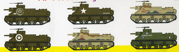 There are six different markings options provided.The first three are US vehicles, all from unidentified units. The first, which is the box art vehicle was in the ETO during 1943. Next is one based in the US during 1942 and the third, with the star in a circle, at Anzio in 1943. The next two are British and in desert camo. The first with A Squadron, 11th Regiment, Royal Horse Artillery with the 1st Armored Division in Egypt during late 1942 while the other is just listed as A Squadron, same time and place. The sixth option is a French version with the 2nd Armored Division in France during 1944.