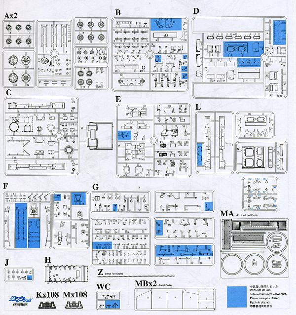 Instructions are typical of Cyber-hobby in that they are well drawn, provide detail information for some of the more difficult assemblies and clearly show any options. The color references are by Gunze paints. There is the box art tank as a markings option with one of five different tank numbers.