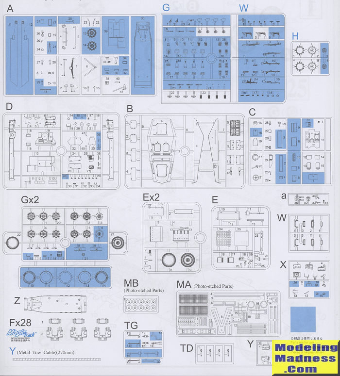 The kit provides a full lower hull on which the suspension, road wheels, sprocket and idler are attached. The front straight acles is also attached to this piece. In this kit, Dragon includes its individual track links which appear to just snap in place. The pads on each link are separate items so one will need to plan some quality time to assemble these. Front wheels are left and right pieces.