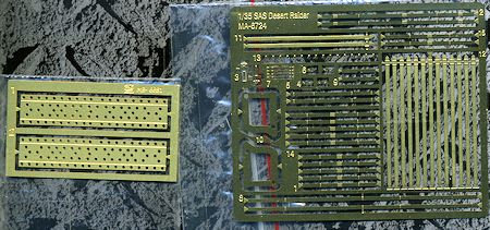 The other is where the combo is in slices of five sections that are sandwiched together. Not sure which is 'better', but it does give an option. A nice sized etched fret is also included which contains a pair of ramps to help extricate a stuck jeep from the sand as well as lots of tiedown straps for all the Jerry cans.