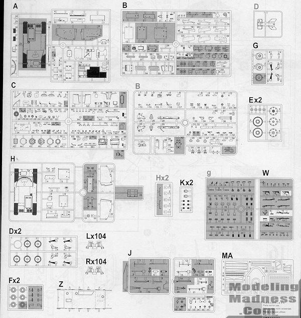 Much of the parts count of 650 pieces is dedicated to the suspension on this kit. In addition to all the separate suspension bits, you have individual track links for each side of the vehicle. As the instructions state 'Make 99 for each side'. As it is also an open topped vehicle, it somes with a relatively complete interior. This includes a full transmission, driver's compartment, and fighting compartment with all the various racks for sheels and for the defensive machine guns.