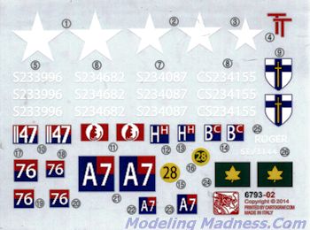 Markings are provided for four vehicles. All of them are in a shade that according to the instructions is RLM 82 light green. All are from units in Europe in 1944 or 1945 with one having some disruptive camouflage in what the instructions list as dark grey. I do not know that much about British armor camo, but those colors seem a bit suspect to me. There is a very nicely done decal sheet with the usual Commonwealth unit markings to add a bit of color.