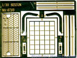 A very nicely 25 pndr main gun and its mount are part of the kit. The exterior hull is built up of flat plates just as on the real SPG. a bevy of external fittings are included as well as the usual pioneer tools that every AFV seems to carry. The photo etch fret is small and includes a screen for the engine intake as well as one for in front of the radio set to keep things from banging into the radio. Other bits are for tied down