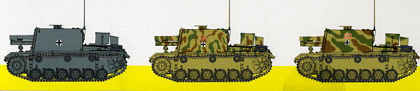 Markings are for two of the units that operated this vehicle. One is in overall Panzer Grey as used by StuG Abt 177 at Stalingrad in 1942. The other two are from 1943 with Pz.Rgt. 201 on the eastern front. These are in later war colors of Panzer Yellow with Brown and Green splotches.