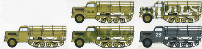 Five different markings options are provided in the kit . Starting on the top row is a truck from Panzer Grenadier Regiment 33 on the Eastern Front in 1943. In fact all of the Panzer Tan vehicles are from the eastern front during 1943/44. The winter camo one is from 4. Panzer Division while the other uncamouflaged one is from an unknown unit. The one with the green bits is from Panzer Grenadier Regiment 12. The last one in Panzer Grey with the big white numbers is from a training unit in Germany during 1942.