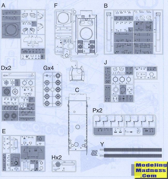 The kit is based on Dragon’s existing Panther family kits, but there are many new parts incorporated into it to reflect the characteristics of this early prototype. These differences include the turret (with curved sides), upper hull, engine deck and road wheels (with 18 rim bolts instead of the later 16). Another example of its differences was that there were no interlocking armor plates on the hull.