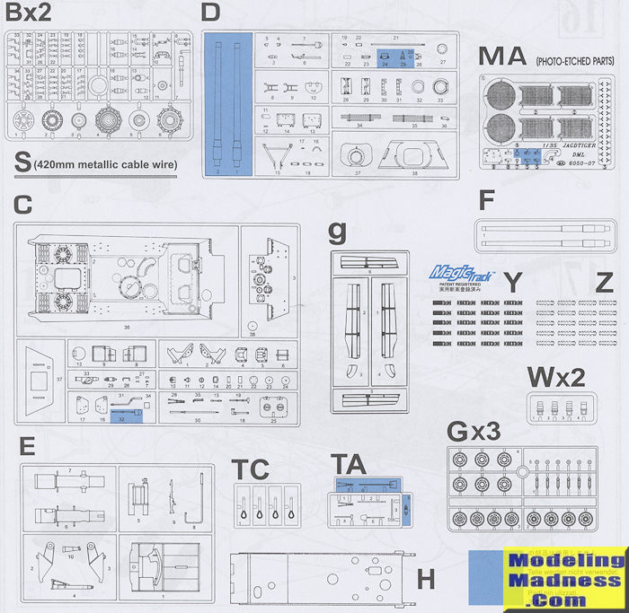 Dragon continues to produce low production or paper projects based on extant kits. In this case, the standard Jagdtiger gets a longer gun barrel and that is pretty much it. This is shown on the F sprue in the parts image. The rest of the kit is the same as their standard and very nicely done Jagdtiger. This one has the Henschel suspension. It also includes separate track links which make up many of the 330 parts.
