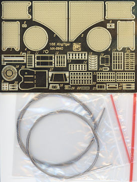 The kit comes with a nice photo etch fret and two sections of thick metal wire to use for towing cables. The p.e. is used mostly for screens and for the rather large number of brackets used to hold the towing cables and various pioneer tools in place on the upper fenders.