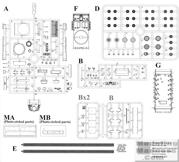 The kit provides a nice photo etch enhancement in the form of intake and exhaust grilles, something that is perfect for this medium. The kit also includes Dragon's superb DS tracks. The turret includes a nicely done gun and mantlet along with the bustle that was used on this version. What is different on this kit of the ausf M is the inclusion of plastic sprues and photo etch fret that includes the hull and turret schurzen along with their attachment brackets. Confusingly, these new sprues are also labeled 'B'.