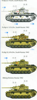 Instructions are well done with a full color painting guide. Four options are given, all in overall desert tan. First is a winter whitewashed tank from PzRgt 25, 7 PzDiv in South Russia during 1943. Next, with brown squiggles over the paint is a tank from PzRgt 4, 13 Pz Div, also in South Russia, but during 1942. With green squiggles over the paint is a PzRg 33, 9 PzDiv vehicle, also from South Russia in 1942. The final option is from the Wiking Division in Russia during 1942. No additional camo on this one. The small sheet provides all the necessary markings and is nicely printed..