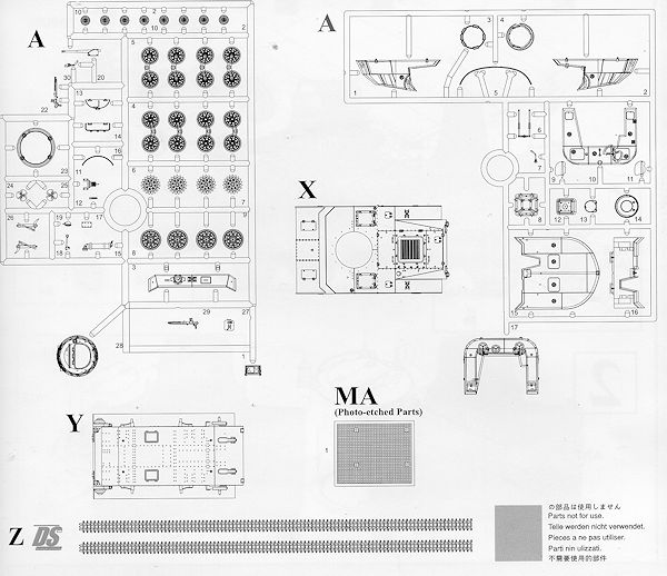 These bits include an extension to the turret to keep out water and a tall intake housing to keep from flooding the engine while in the water. Like the earlier boxing, the detailing is superb for such a small scale tank. The same nice DS tracks are used as well. Bogies are molded in sets with the fore and aft road wheels molded along with the frames. In fact, one basically builds up the standard Type 2 and then attaches all the rest of the stuff in the last construction step. Like the earlier boxing, a lone piece of photo etch is provided for the muffler screen.