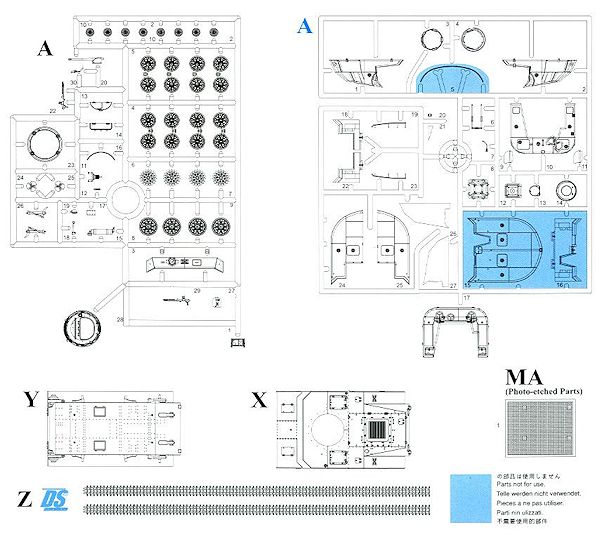 This kit is pretty much the same as the earlier boxing with the pontoons. To accommodate what is a considerable increase in the stuff that is attached to the tank, a rather large sprue is included which has the forward and aft pontoons along with the attaching bits. The difference between the standard and 'late' version is a slight change in the forward pontoon pieces with the new bits being in two halves rather than a single construct. The older pieces are also on the sprue, but not used.