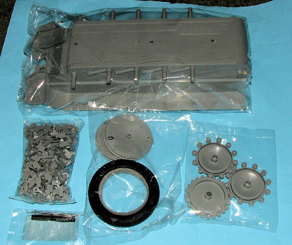 The kit also has a nicely molded rubber or vinyl front tire that is already mounted on the rim. Probably the most complex part of the kit will be assembling the tracks. They won't be difficult, but there are a lot of parts. In fact there are so many large parts that rather than show them all, I photographed some of the major bits and have provided the parts layout to give you an idea of the rest. In case you are wondering, the body itself is over 15 inches in length, so this will not be a small model when done!