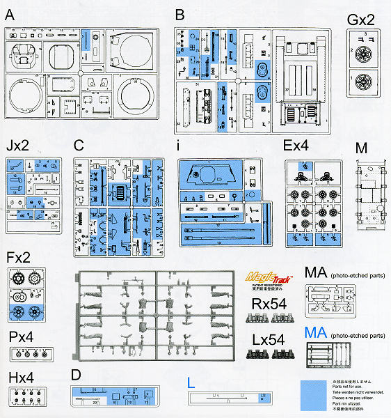 This is basically a reissue of an earlier Dragon kit but with a few additions. One, of course, is a set of figures. In this case, it is 6191, a panzer crew. All of these men are in various poses outside or atop the vehicle. Another new item is a newly tooled gun barrel with hollowed out ends. Finally, this is equipped with 40cm Magic Track individual link tank treads. As with current Magic Tracks, the right and left sides are different shades of grey, making it much easier to get things on the correct side.