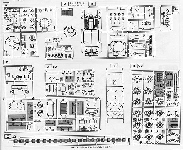 Molded in brown plastic, all the parts come in two poly bags. There are one piece tracks so no worries about individual track links for those of you who do not like them. I'm not sure what bits are unique to this kit, but sprue R seems to be out of place in the normal sequencing of sprues so may well have all the bits that are unique to the early version of the Chi-ha. This includes the upper hull and turret mount as well as a number of other pieces. Several parts on the other sprues are not used in this version.