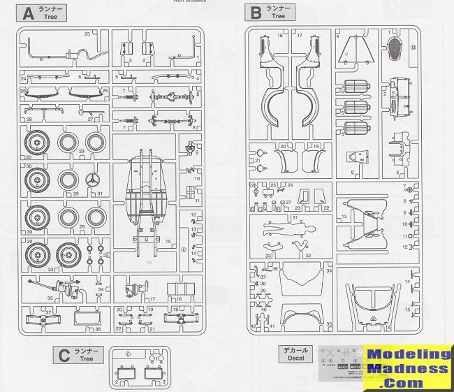 Much of the smaller detail is limited to the interior pieces with separate controls and three one-piece seats. The windscreen has separate clear pieces that could be installed after painting the vehicle. Decals are used for instruments. The car body has separate sides, each containing a rear fender. Despite having a full engine, the bonnet is shown attached closed and no option to have it open is provided. The rear section fits between the two rear fender pieces. The top is molded down and there are separate doors provided. Wheels are a full outer wheel with most of the tire as one piece with a partial tire/inner wheel piece. The kit comes with a standing figure to provide scale.
