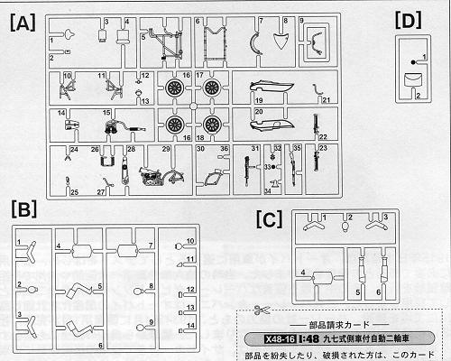 This set contains two complete kits on several brown sprues. Two spruesare dedicated to the rider and passenger figures while the other contains the parts for the motorcycle and the side car. Of course, these sprues are duplicated in the kit. A pair of clear sprues is provided for the side car windscreen and attaching canvas cover.