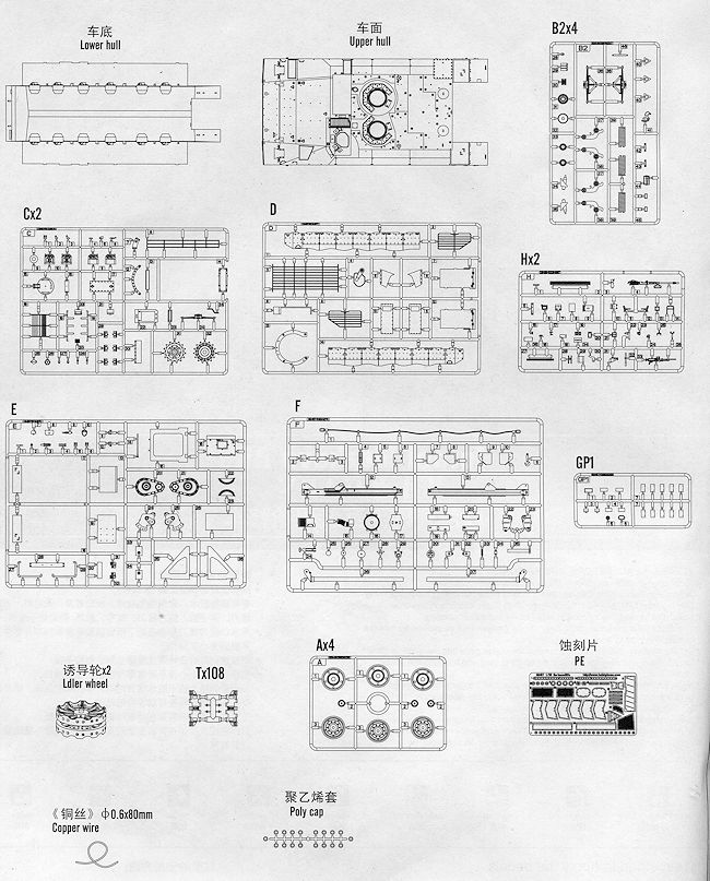 In line with other Hobby Boss armor kits, this one is superbly molded in tan plastic with some parts in other materials. There is a single fret of etched brass and this one has a whole new upper hull section, since there is no turret.