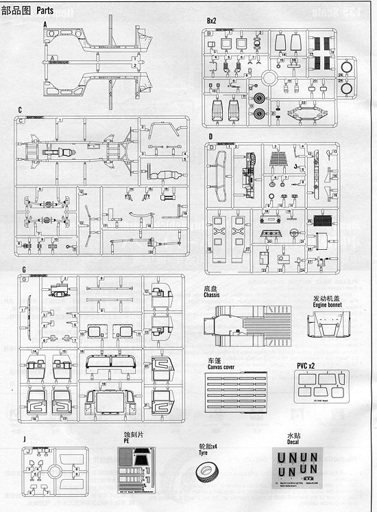 Instructions are well drawn as you would expect from Hobby Boss. Also typical of Hobby Boss military kits, there is no color information provided during construction, so you are on your own as to the color of interior components. The exterior painting and markings guide is in full color with several paint references. Two color options are provided. One is the white vehicle as shown on the box art with UN markings on the door. These are the only vehicle markings provided on the decal sheet. The other is a standard olive green version that is devoid of any external markings. The decal sheet (not shown) is well printed and in register.