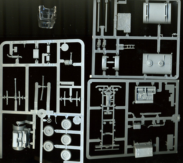 The kit comes packed in two ziplock bags. One for the clear cab and the other for the rest of the parts. The general feel of the kit is very much like a Matchbox offering with its square sprues and rather good detailing. You get a one piece frame wht the lower engine molded in lace. The front and re