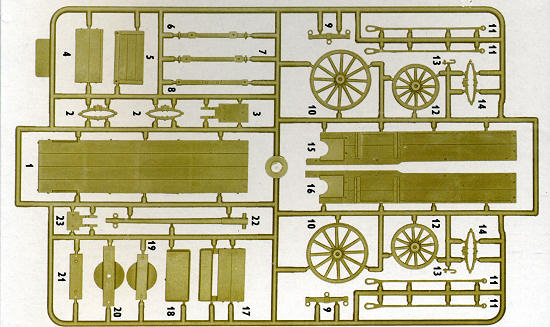The lone sprue is well molded and while there is no instruction sheet per se, two photos of the completed cart are shown on the back of the box, indicating what parts go where. No color information is provided as I guess you can pretty well paint these how you wish.
