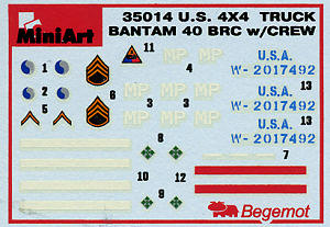 Instructions are in full color on one side of the sheet and provide very nicely illustrated construction steps on the other. Color information is provided for a number of paint companies so you can be sure to find what you need. The color markings and painting guide also gives you the assembly of the figures. A small, but useful decal sheet by Begemot is included that offers not only the proper blue serials for the Bantam, but also patches and insignia for the soldiers.