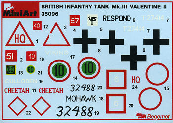 or water cans. The kit also comes with three figures. Instructions are well drawn though they can seem rather busy at times with 55 construction steps. Once again, no color information is provided during the build of the kit, leaving it up to box art and references for that sort of information. There is a full color exterior and figure painting guide provided that offers a wide range of paint manufacturers. The decals are well done and are basically tactical numbers. Markings are for seven vehicles, all which are basically desert tan or with additional areas in armor green. With the exception of a captured German tank, all are from the 23rd Armoured Brigade in 1941/1942. It appears that the tan was painted over the original green as many of the tank names are against green backgrounds. That being the case, the rubber on the road wheels should have overspray on them. Decals are by Begemont, which have a reputation for being quite good.
