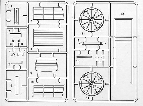 The cart is molded on two sprues, so it is not really a very complex kit. Their usual fine quality molding is evident and while there isn't much else to say about it, I should mention that there is a step for the right side as well as a right side brace to keep the cart level. No harness or animals with this one, but I'm betting one will soon appear.
