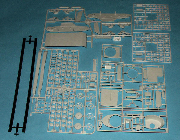 This Mirage kit of the Russian T-26 is very much an 'old school' tank kit. All the sprues save the track are in white plastic. The molding is quite good with only a trace of flash on a few parts. One side of most large pieces is covered with ejector pin marks, but these should be invisible once the kit is finished.