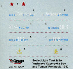 Instructions are a semi-3D photo-realistic type though they are somewhat lacking depth in a few illustrations. Mirage has used glossy paper for this one and all of the parts are clearly shown. Color is by Vallejo references, though each option is pretty well Dark Green, as if they were painted when received. However, this isn't the case as most of the markings options still have the blue serial stencils that were placed on the tanks when with the US Army. I'd lean more to a greenish OD for overall color. No color info is provided during the build up. Decals are for four tanks, each with Soviet markings over the standard US ones when the tank was delivered. All are from the 1943 time period.