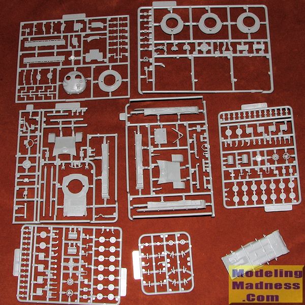 The upper hull is actually several pieces. There is a forward section on which more applique armor is applied. The rear section includes the turret ring and the aft end on which one installs a pair of fuel drums. Moving to the lower hull, all the suspension pieces and mounting plates re separate items. There are the usual return rollers, road wheels, sprocket and idler ger to attach. This is followed by the DS-style tracks that ModelCollect uses.