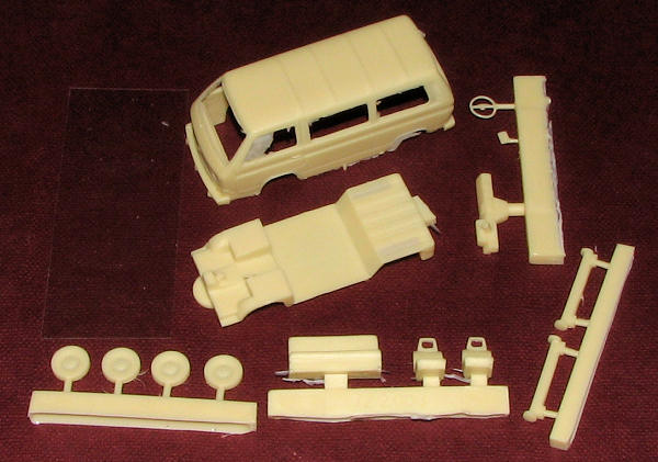 The PJ Production kit is very nicely molded in a tan resin. The box is labeled as a retooled edition so apparently this is an improvement from the previous kit. There are fifteen very nicely molded resin bits that include a one piece body, one piece chassis, four wheels, a rear bench seat and front driver/passenger seat. There are also two axle assemblies, a dash board, two side view mirrors (one broke loose in shipping) and a steering wheel.